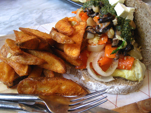 Grilled veggies on whole wheat bread, lightly drizzled with olive oil.It could pass off as a vegan sandwich if you set aside the feta cheese cubes. :)